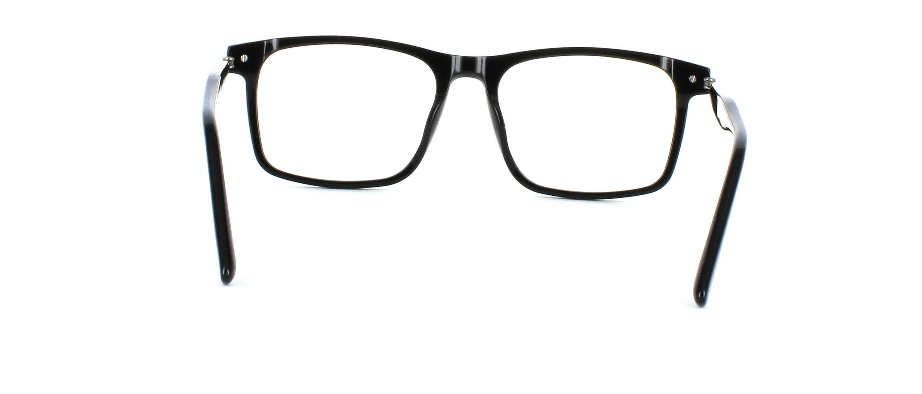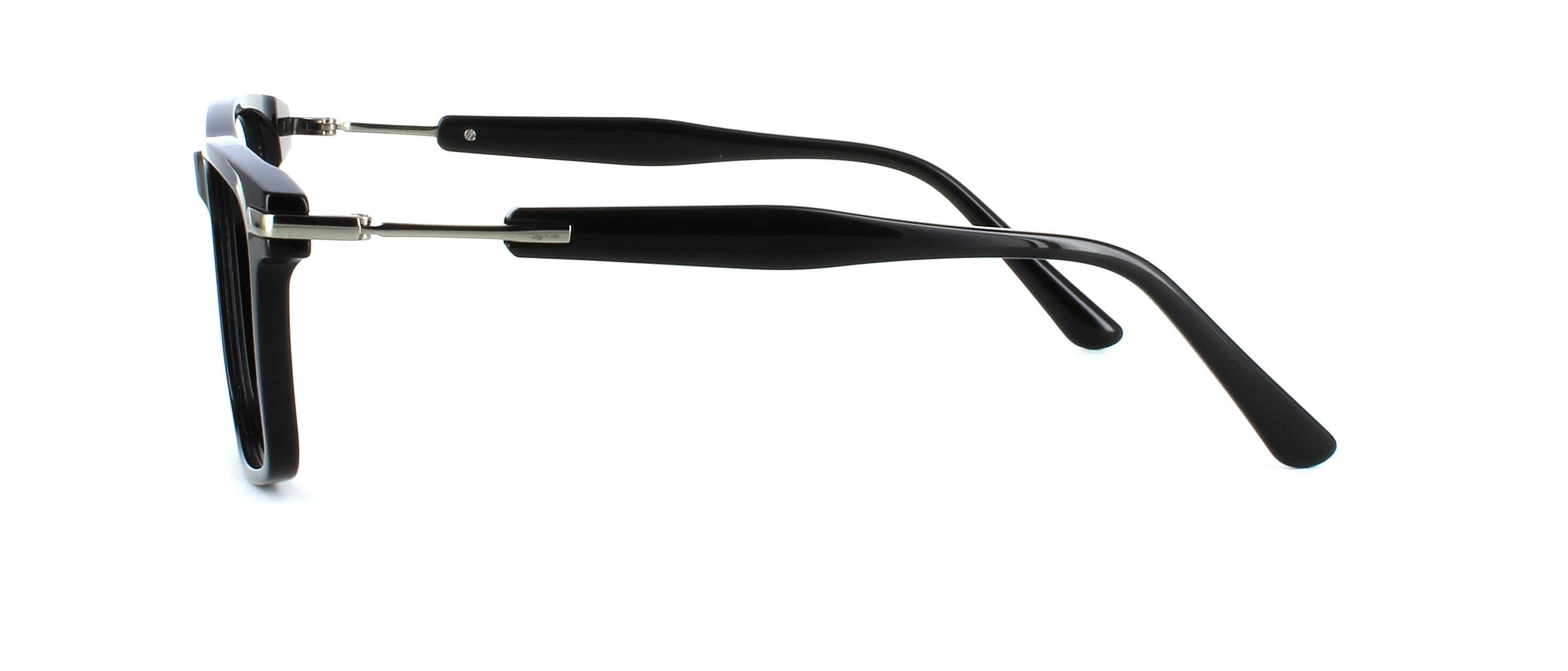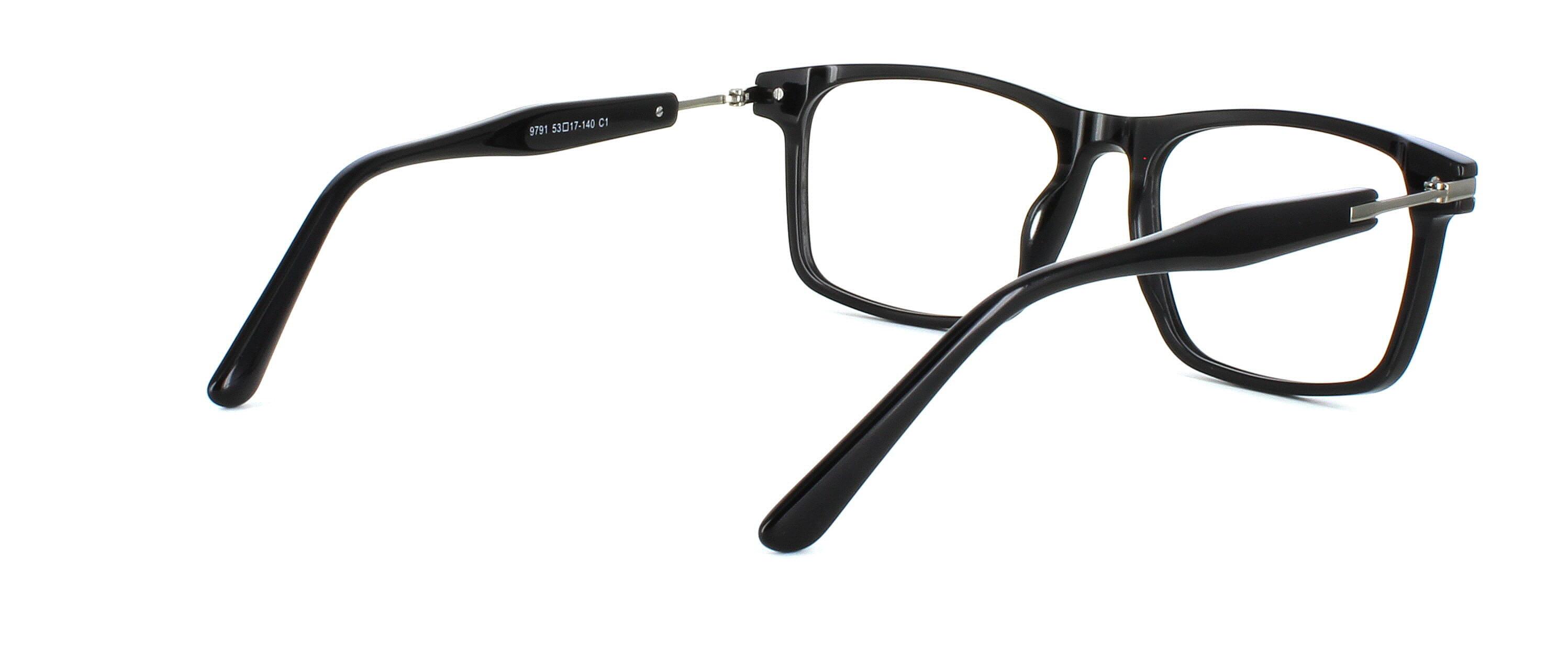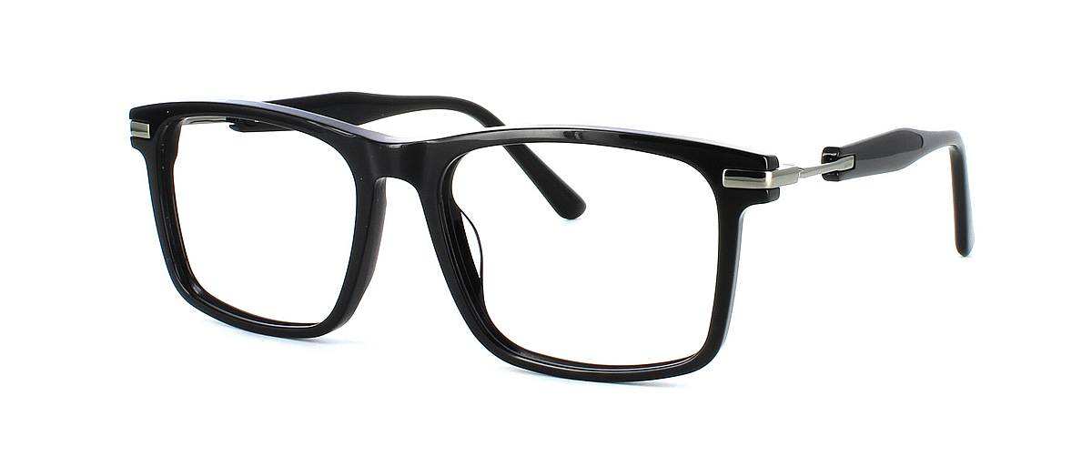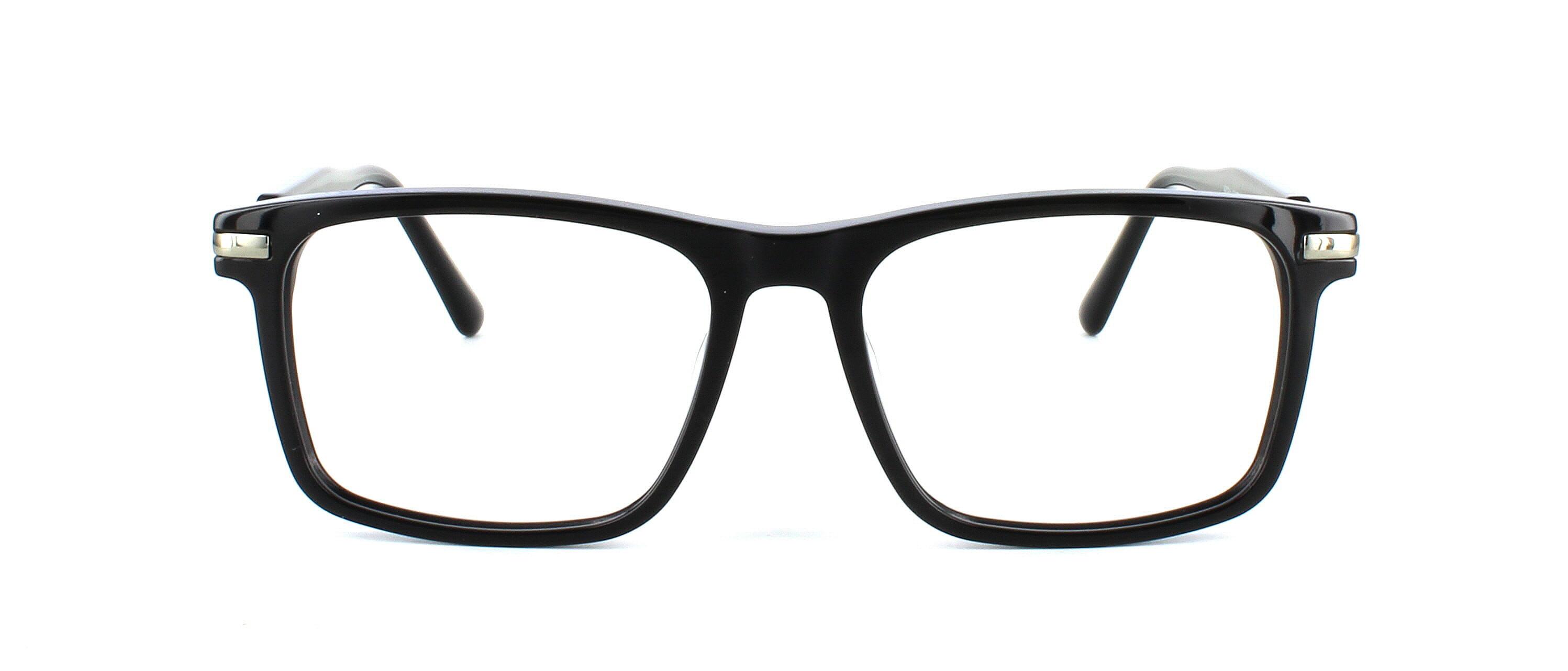 Stylish smooth unisex acetate rectangular shaped frame in shiny black. Smooth matching acetate arms with fixed metal hinges and metal temples.