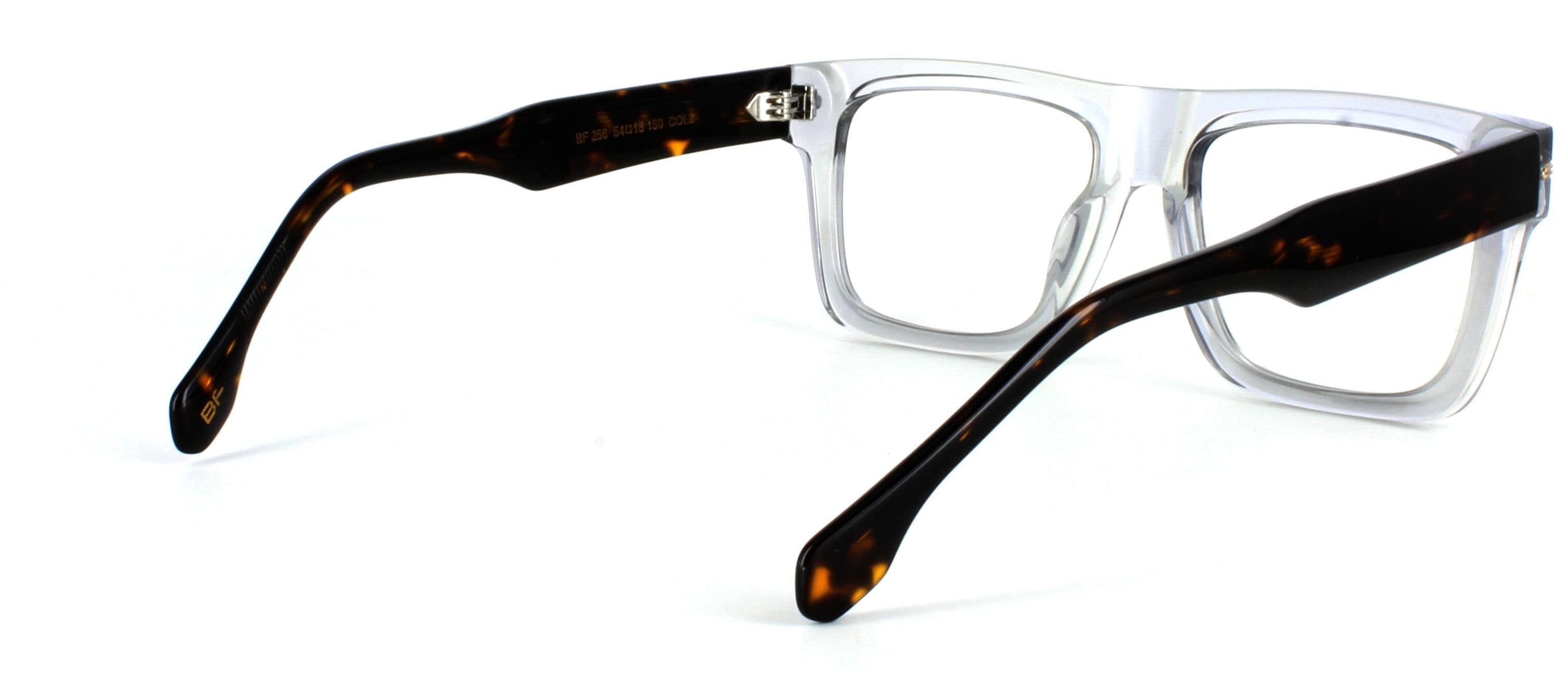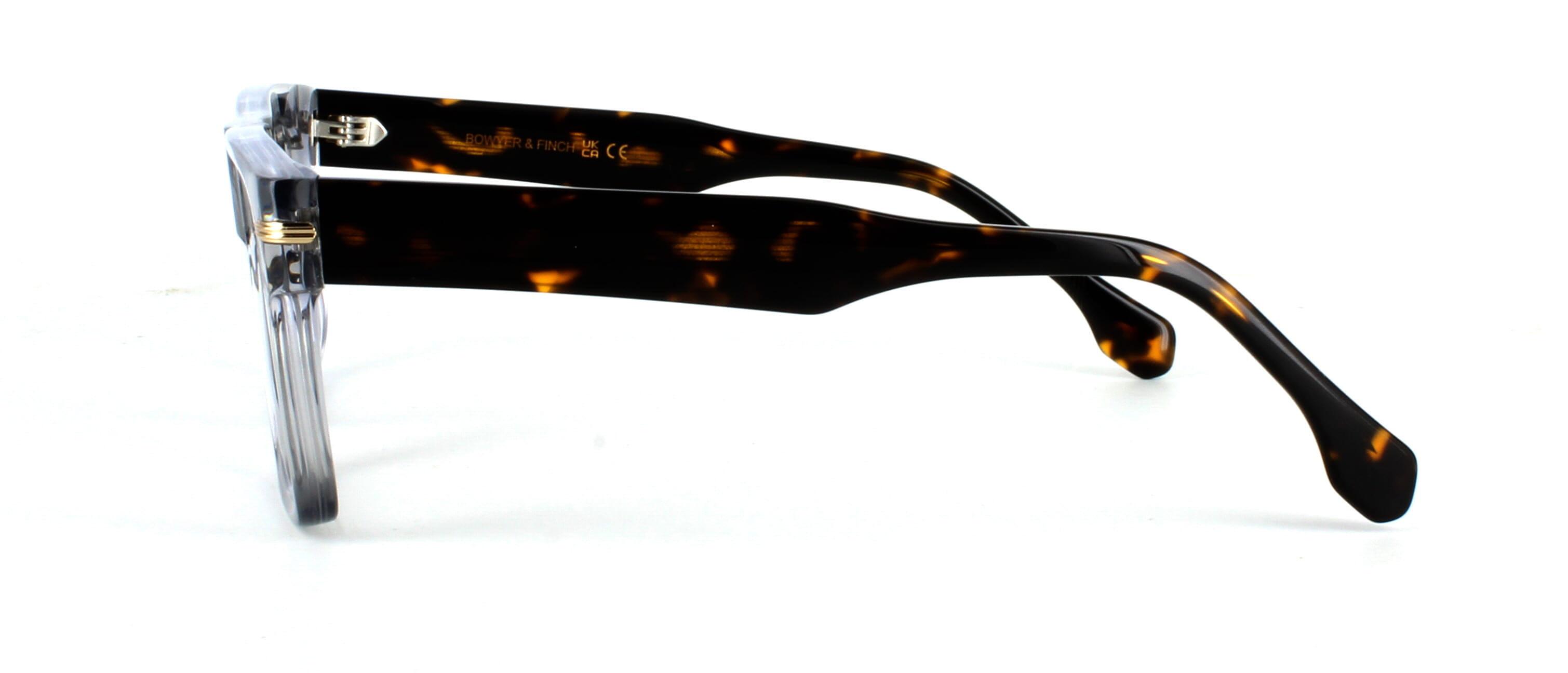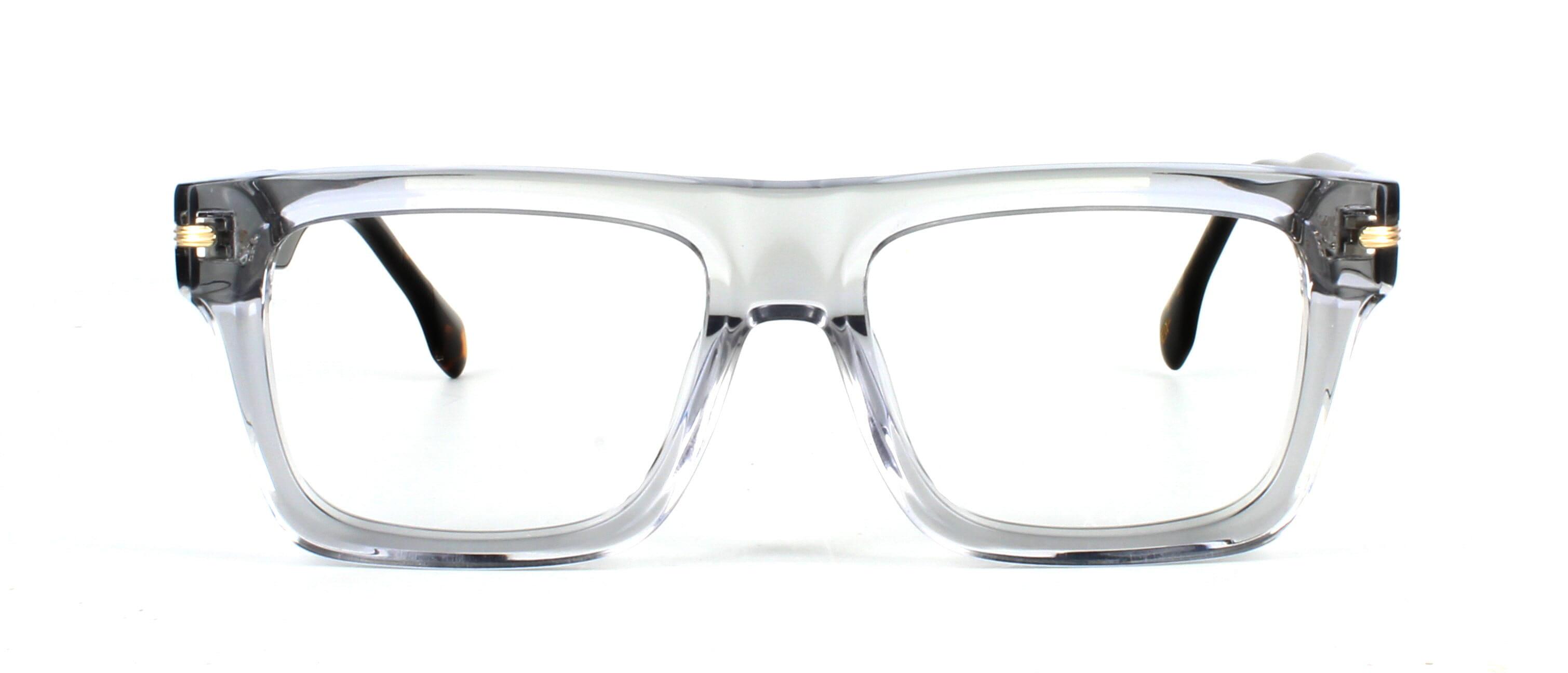 Men's chunky hand-made acetate glasses frame with rectangular shaped lenses with a crystal grey front face. Gold metal detail to the temple and five barrel hinges attach the front face to shiny, smooth tortoiseshell acetate arms.