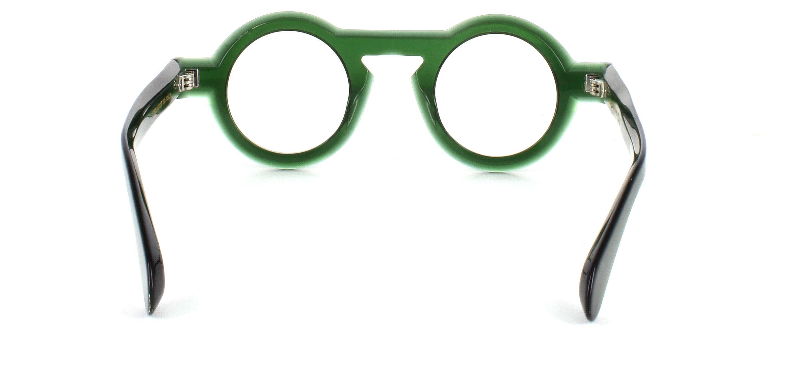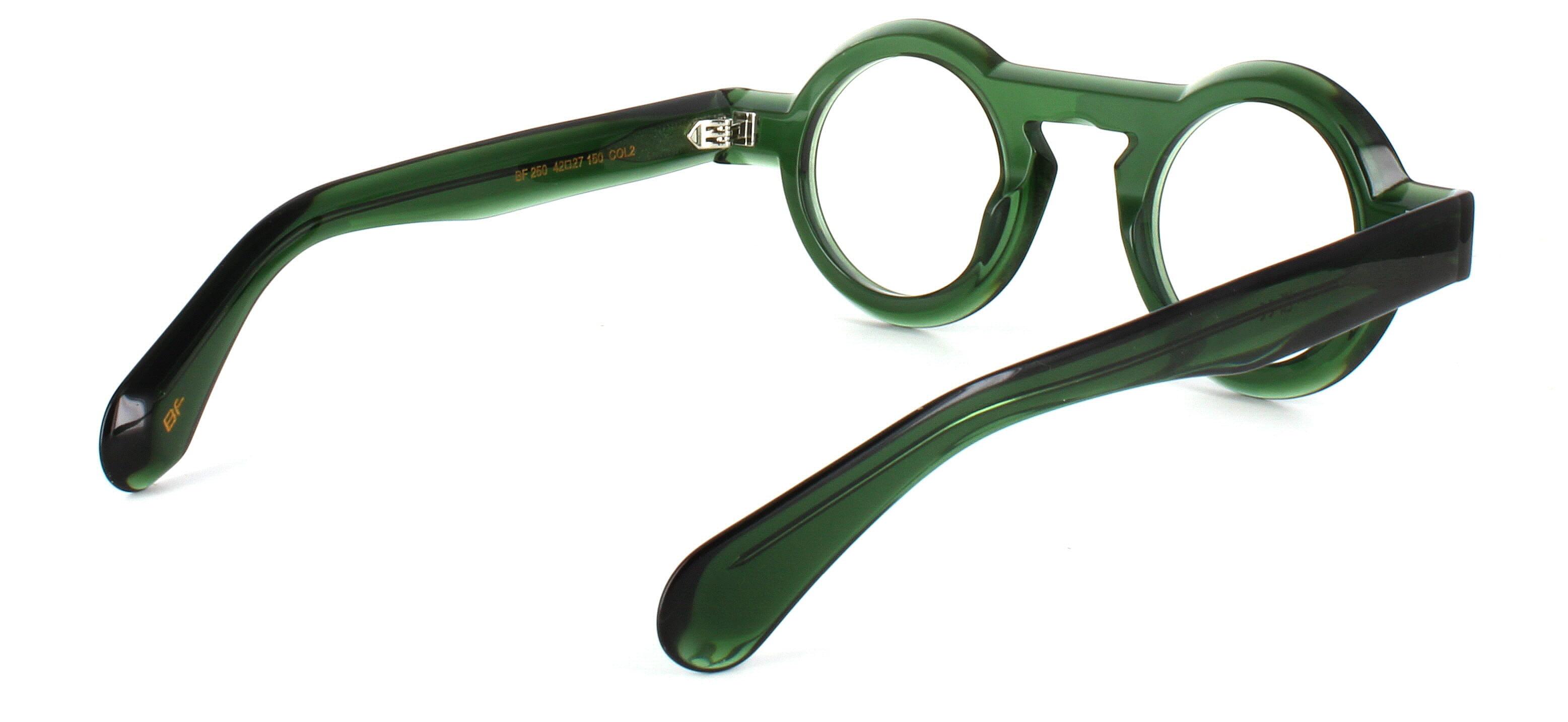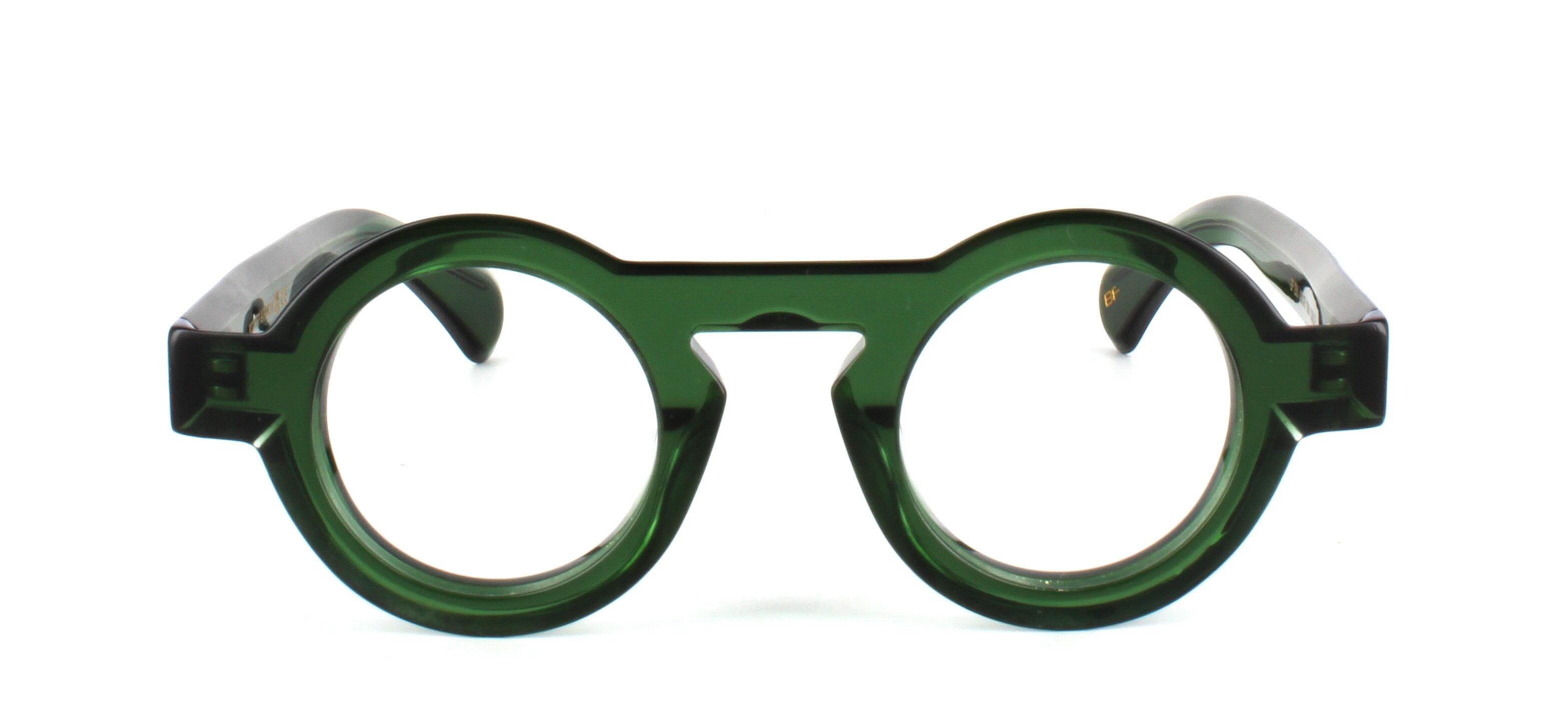 Make a statement with the Bowyer & Finch Vespasian, a striking pair of unisex round glasses that blend vintage artistry with modern craftsmanship. This thick, glossy, dark green acetate frame commands attention, while the unique geometric bridge and solid temples add an avant-garde edge to a timeless silhouette.