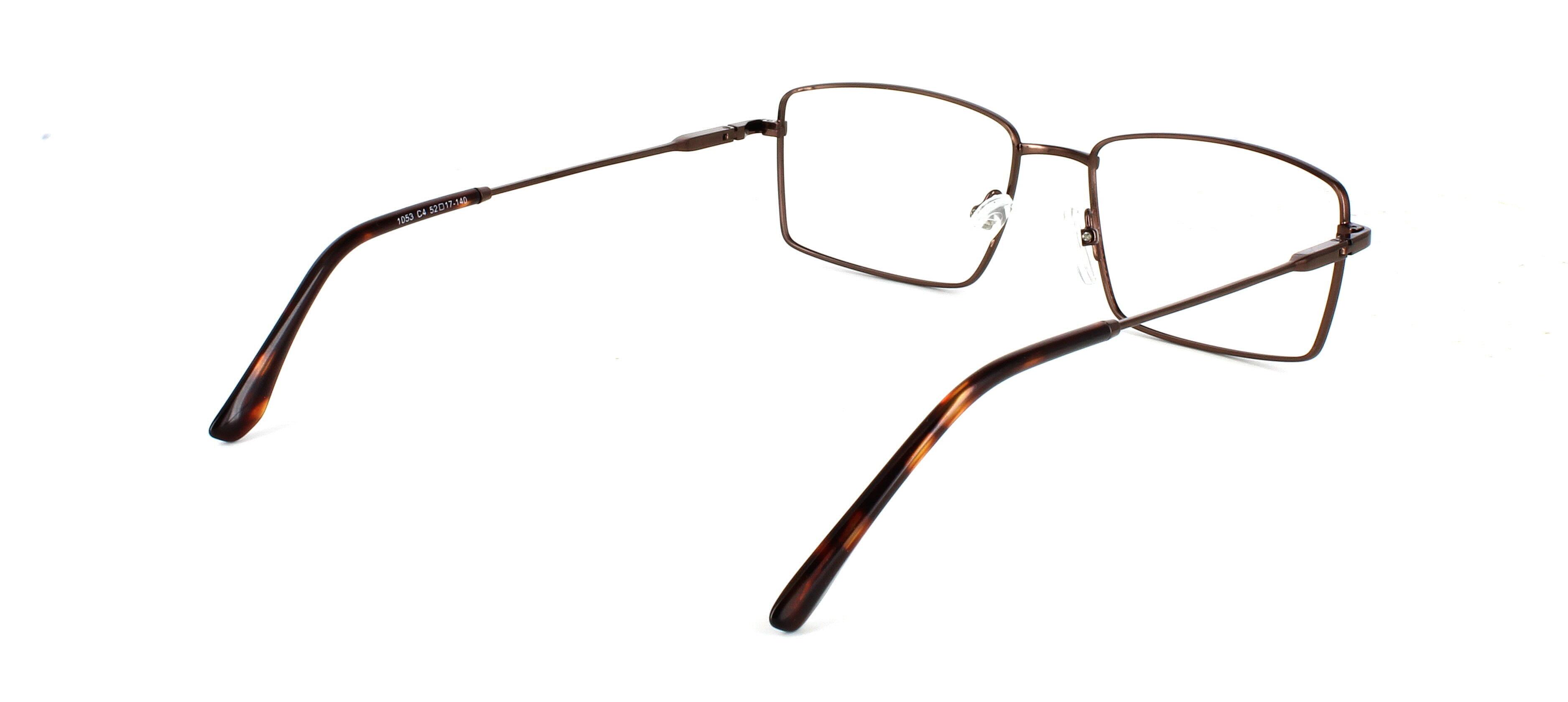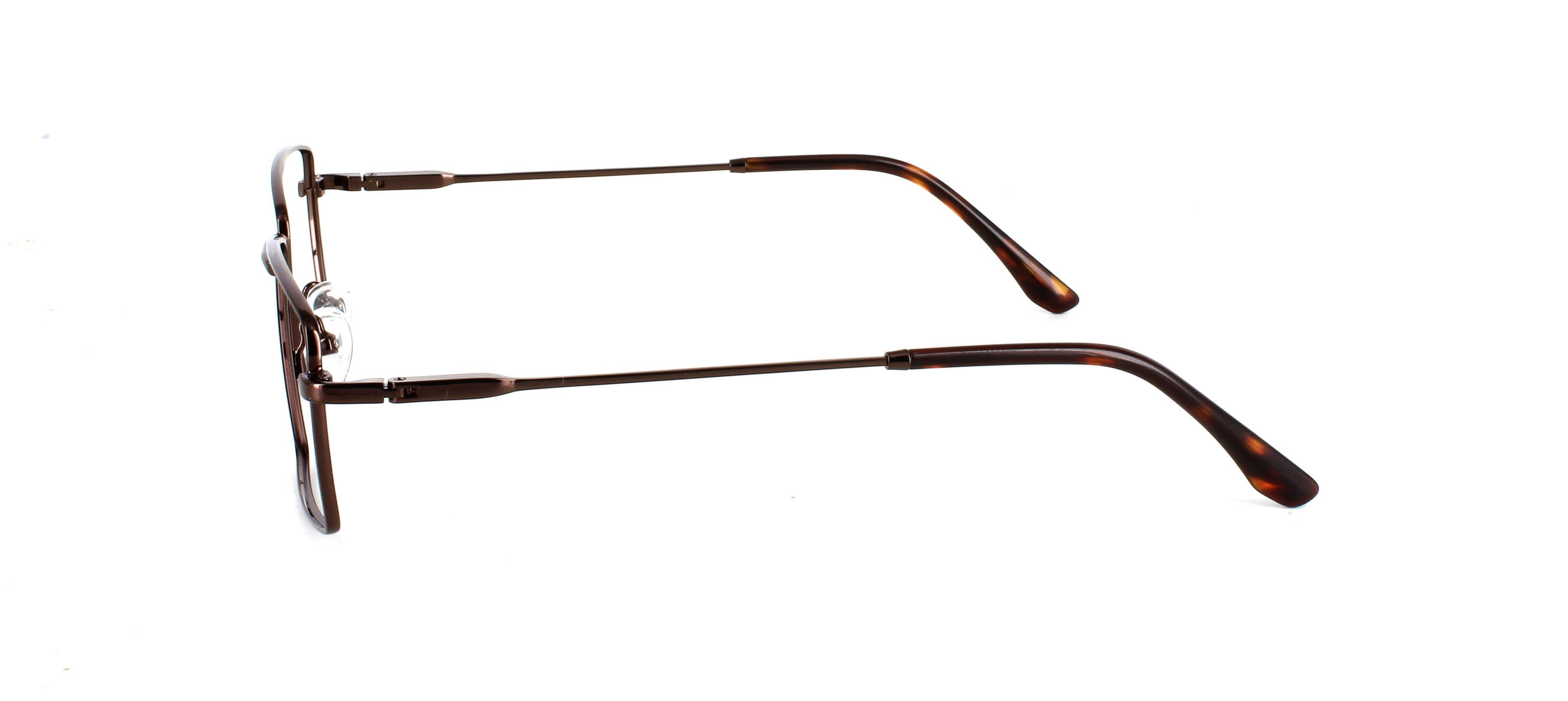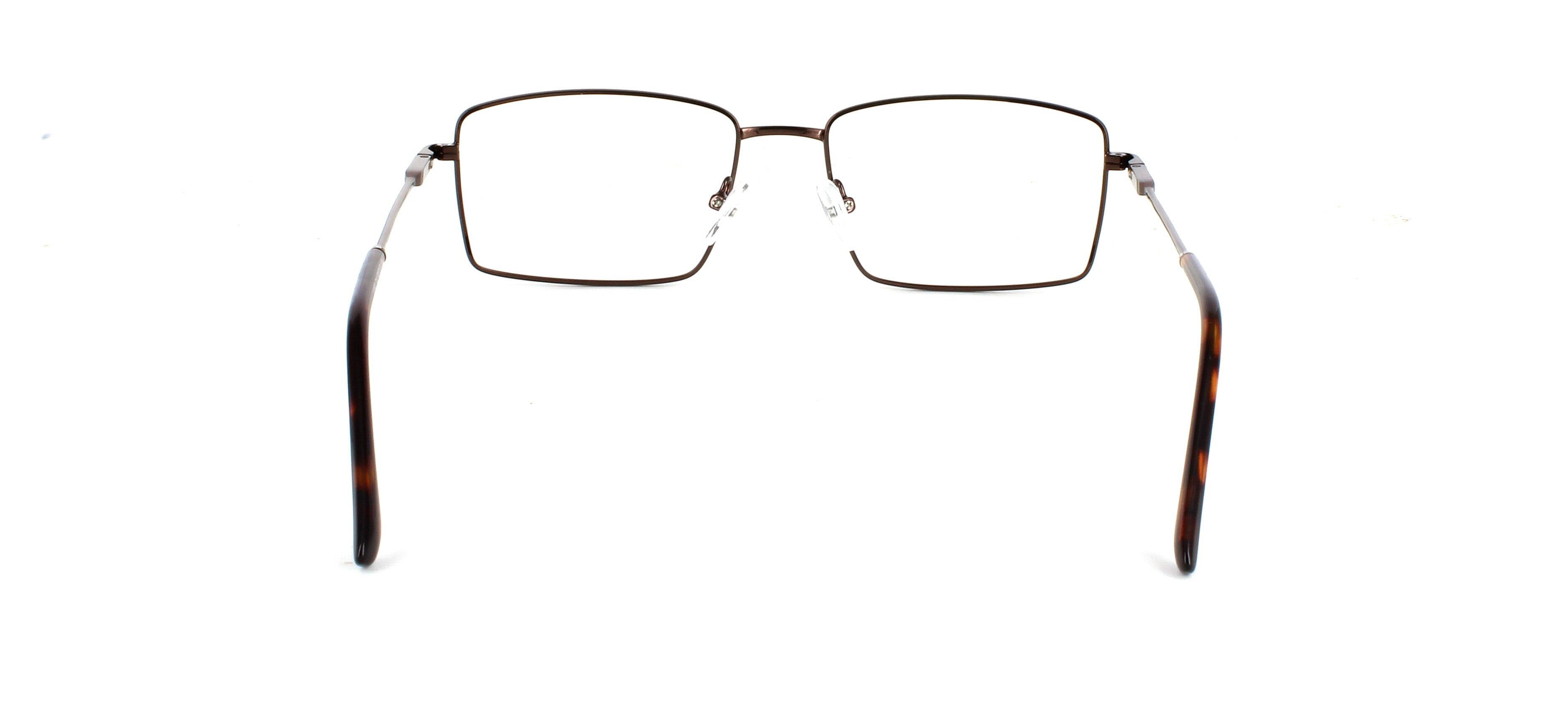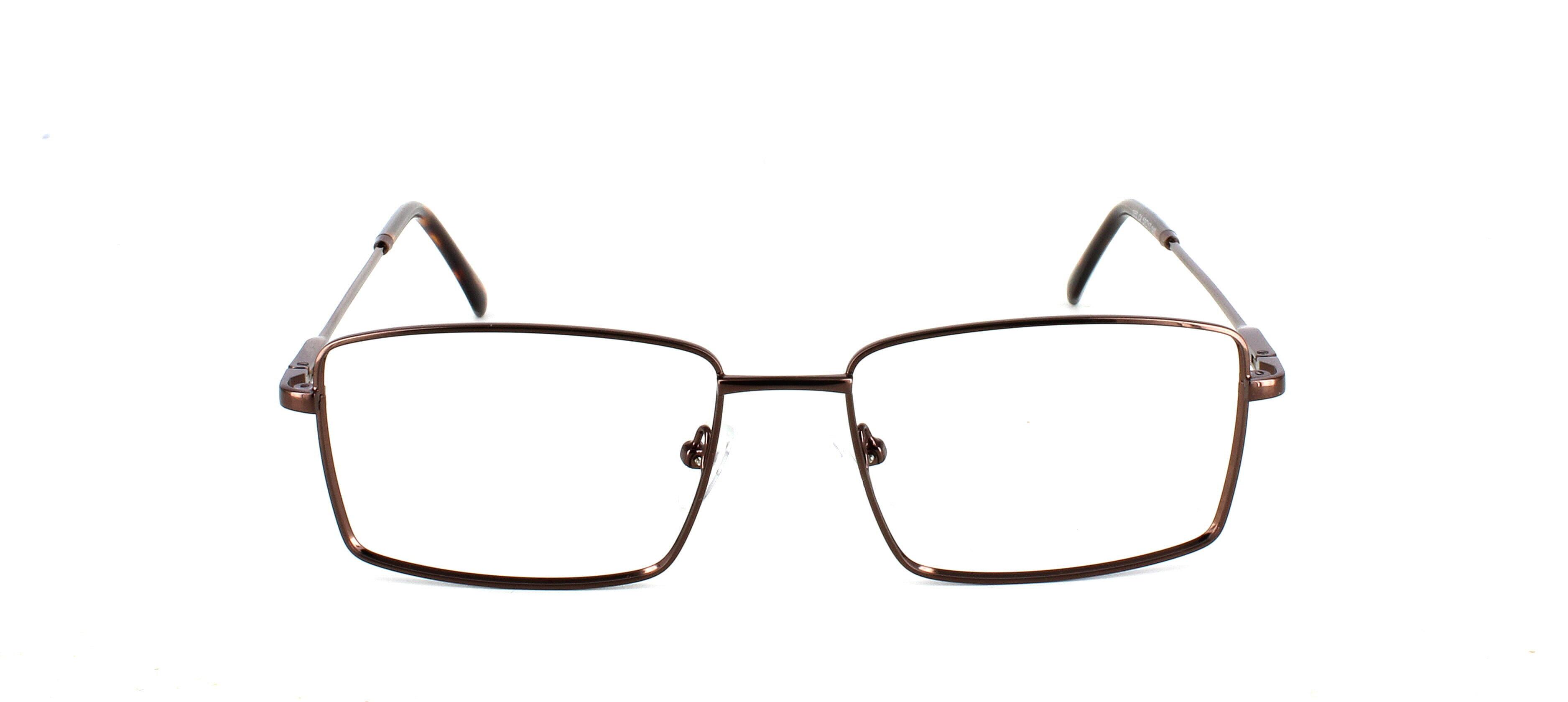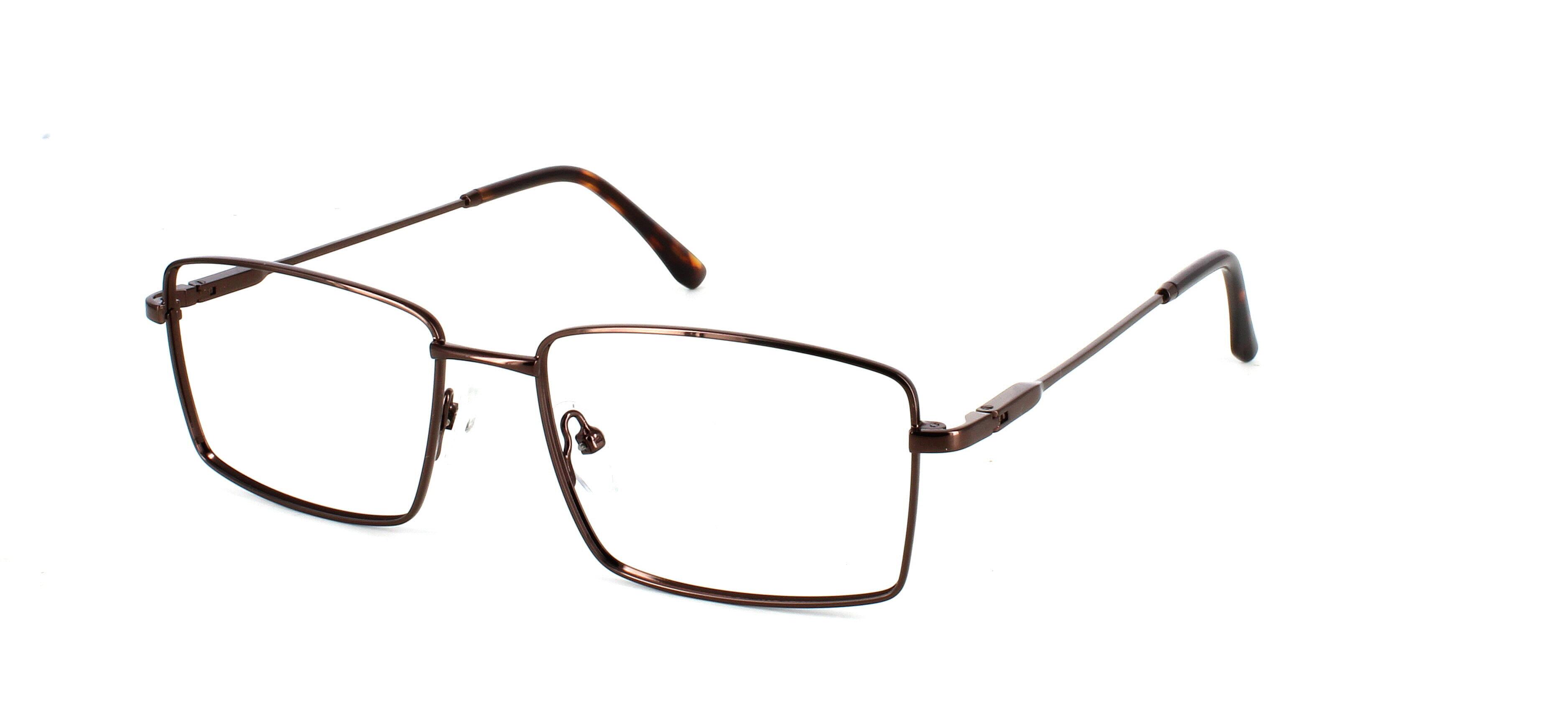 Catan, here presented in shiny brown is a rectangular-shaped gents metal frame with shiny tortoise acetate tips. These frames have a sprung hinge temple for added comfort and durability, making them so comfortable you won't even know you have them on!