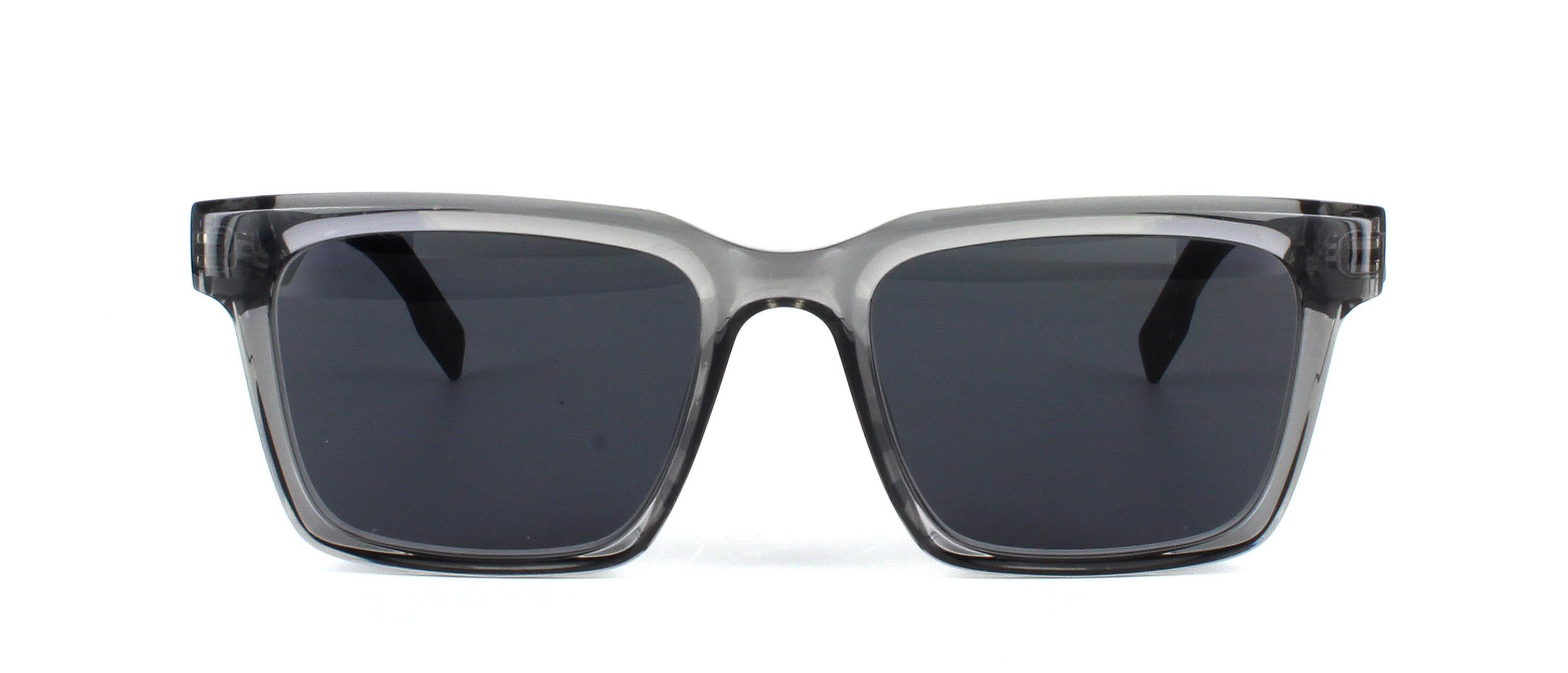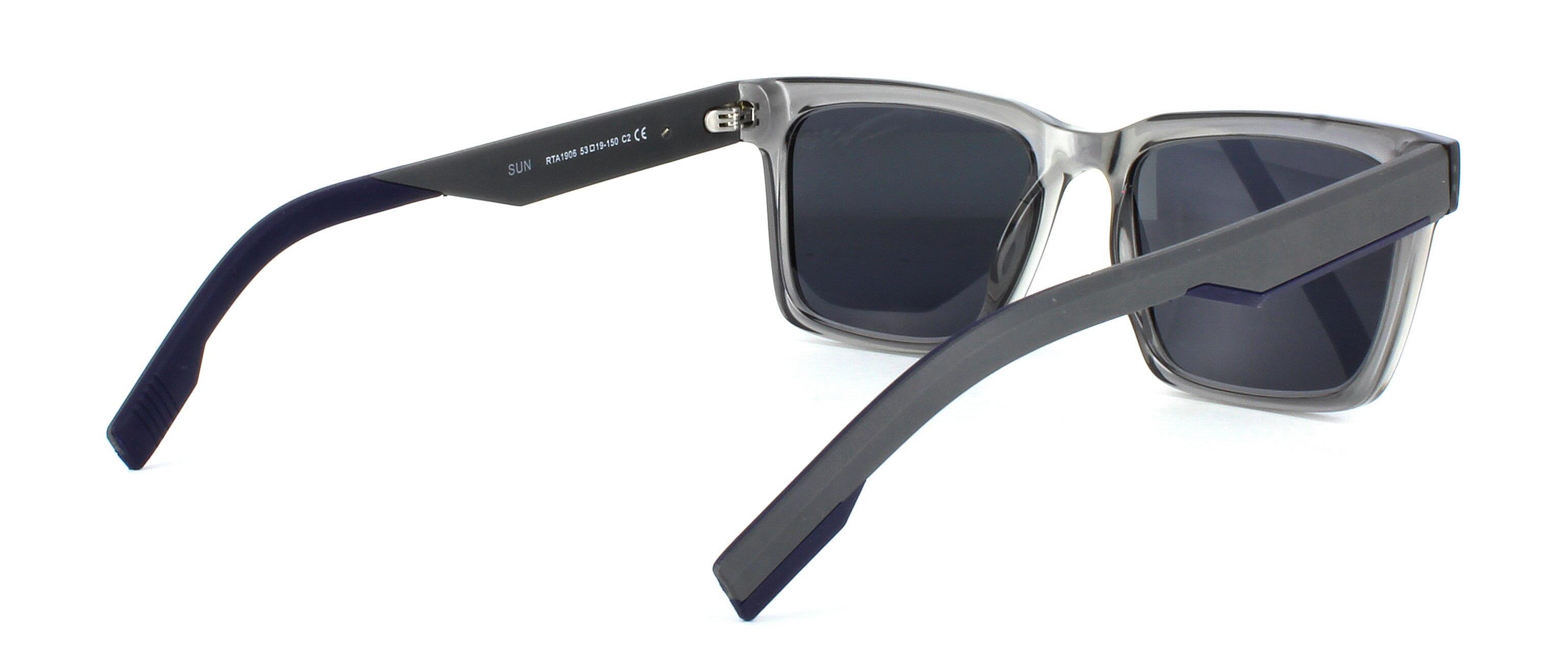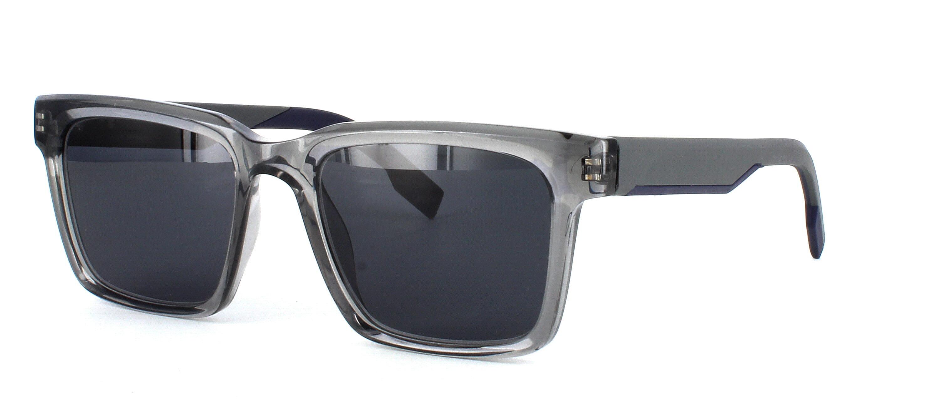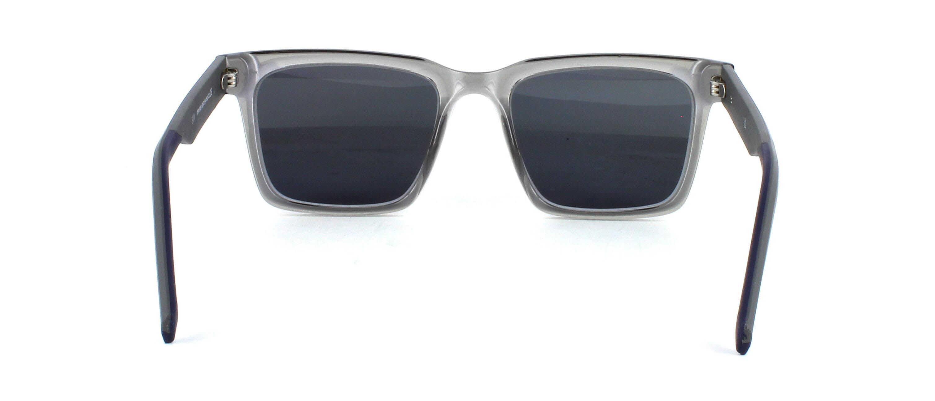 A very stylish hand-made acetate frame for men with a crystal grey face and matching arms with dark blue accent.
