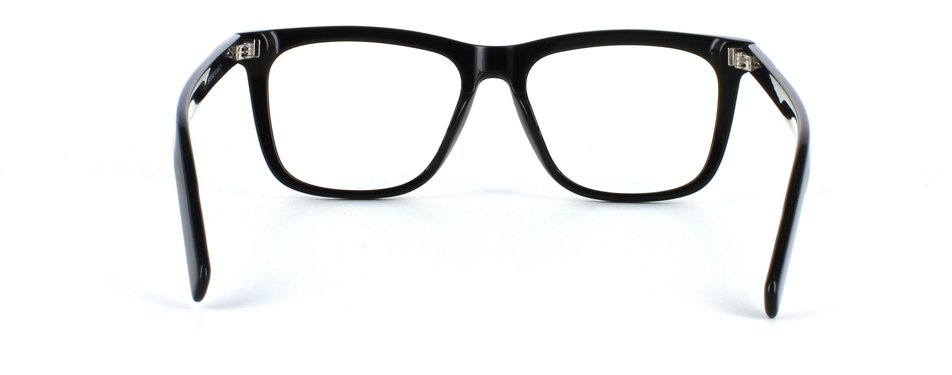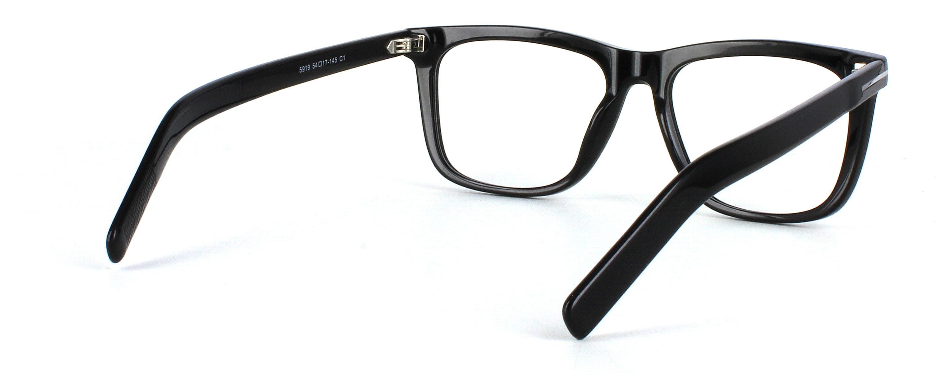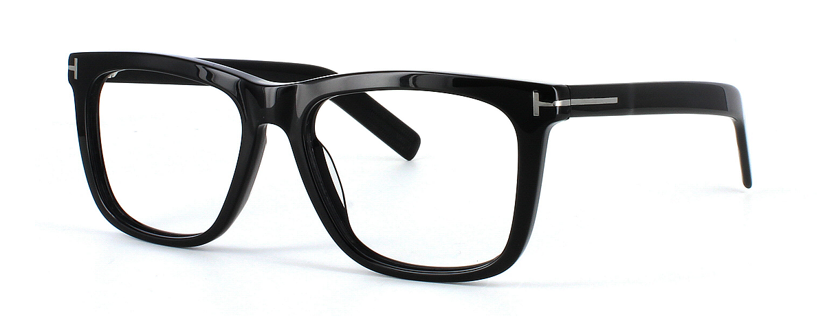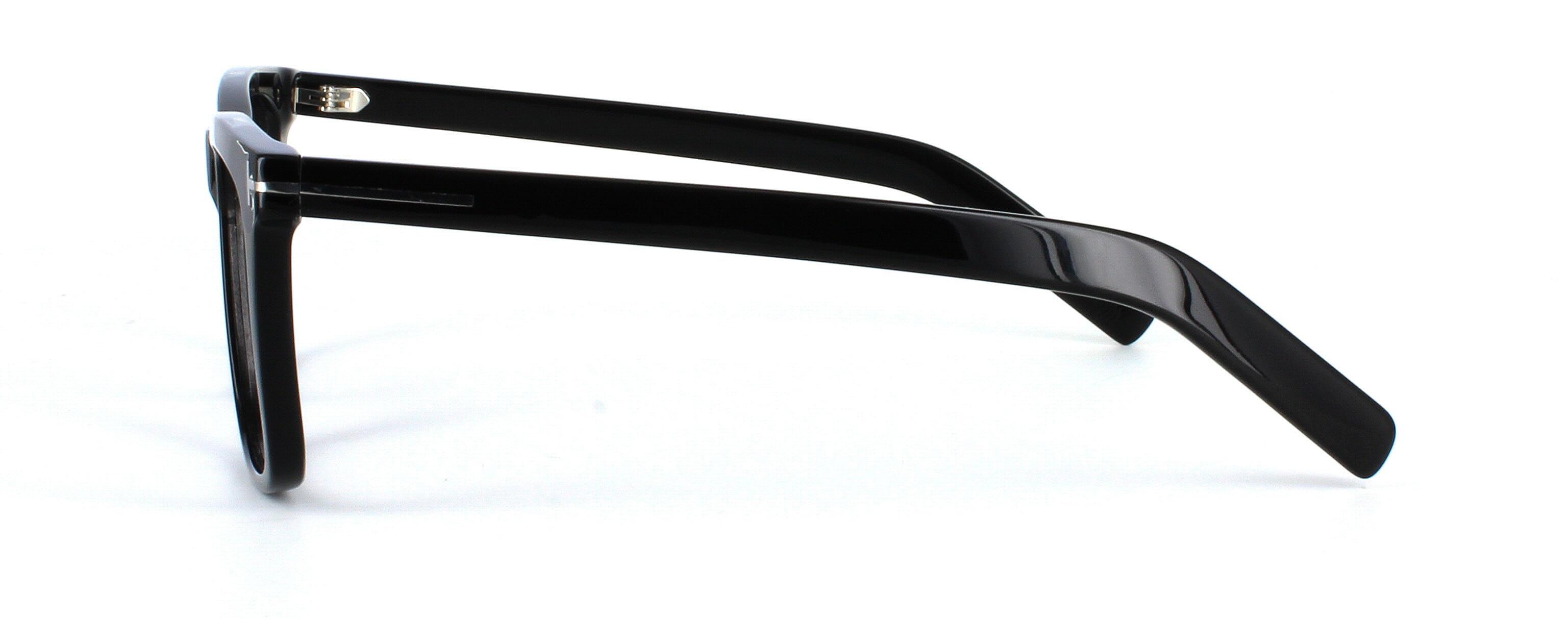 A very stylish hand-made unisex acetate frame with a shiny black front face and matching barrel hinged acetate arms.