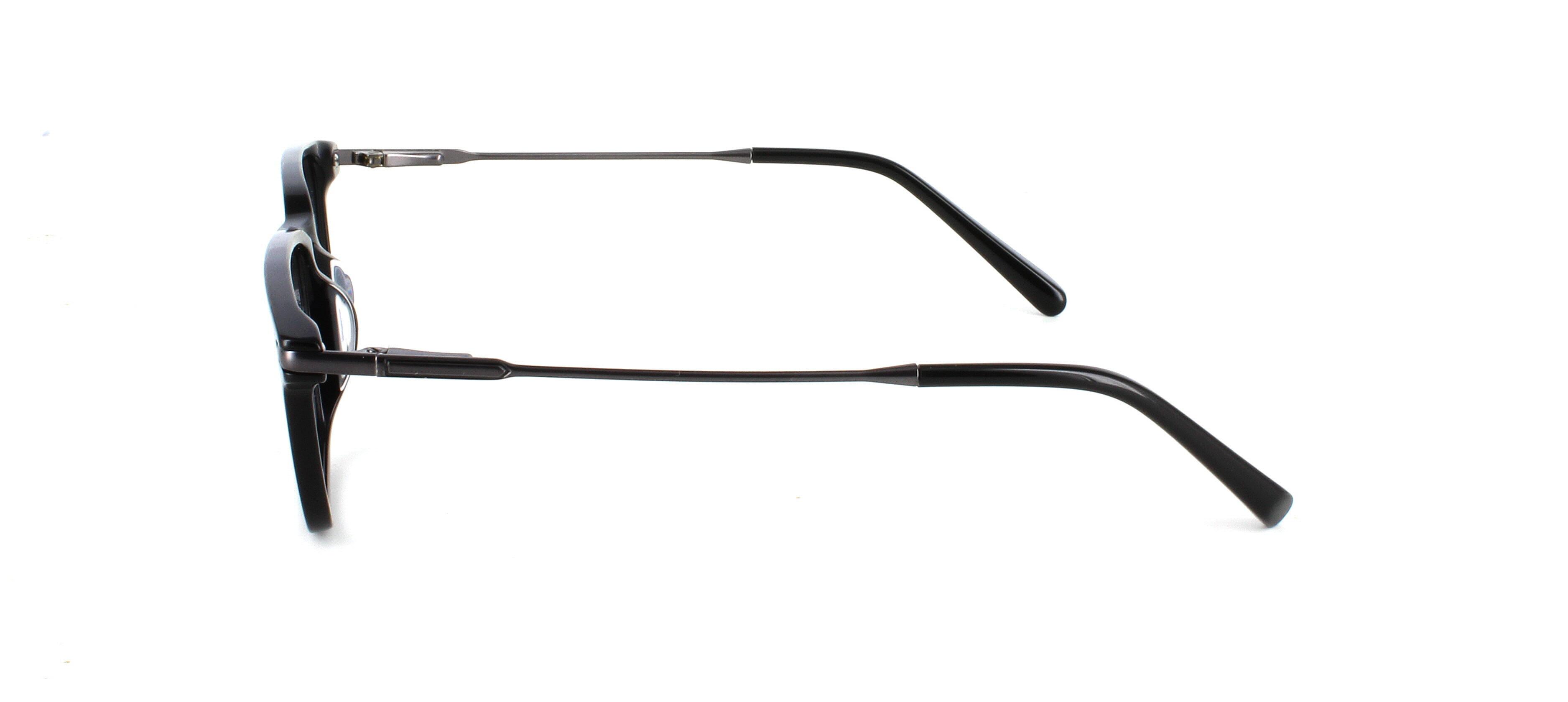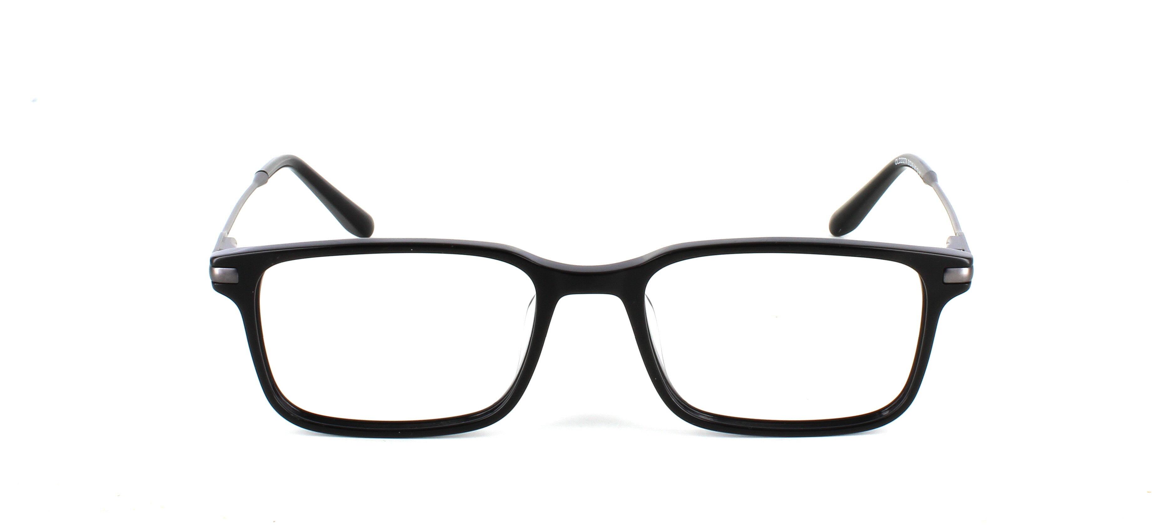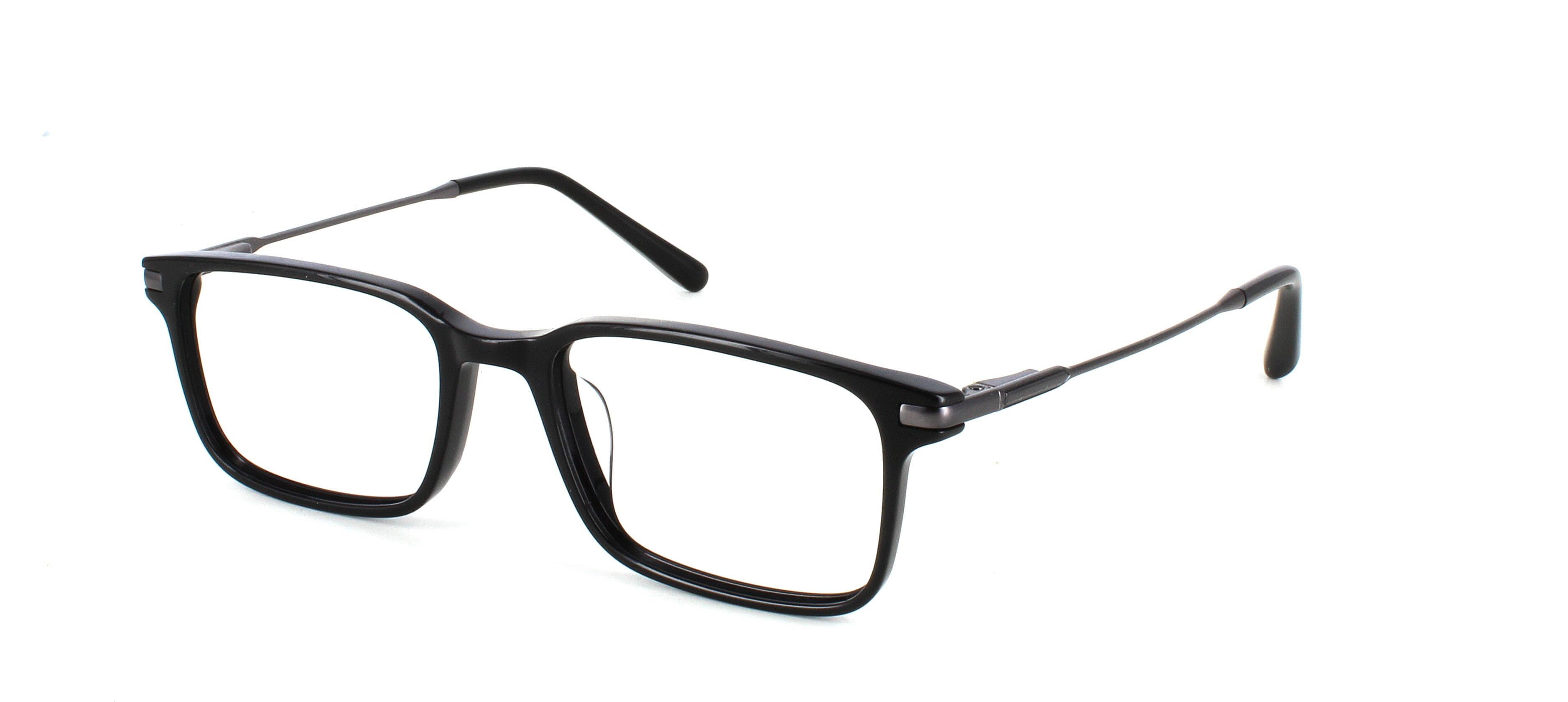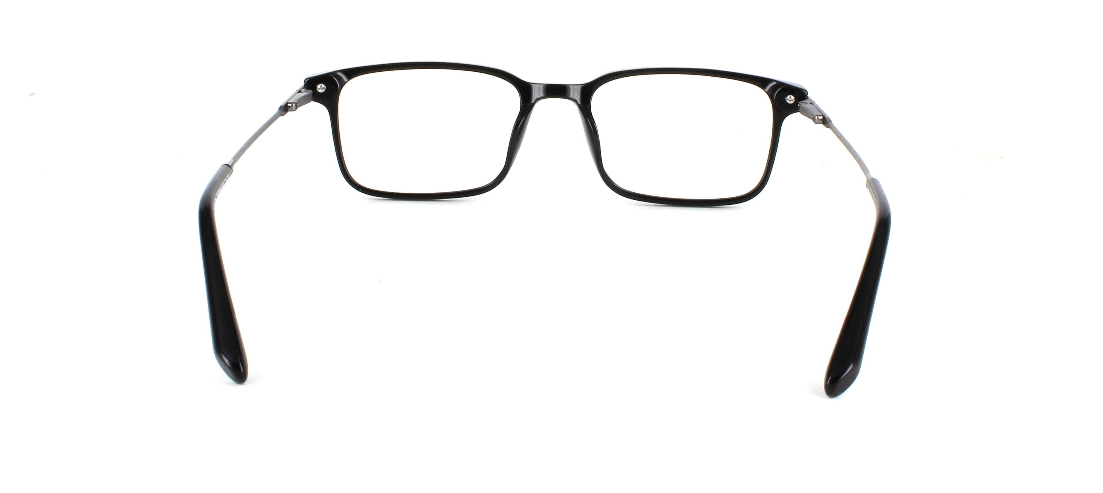 Unisex acetate frame in shiny black with rectangular shaped lenses. Slim metal sprung hinged gunmetal coloured arms for comfort and durability.
