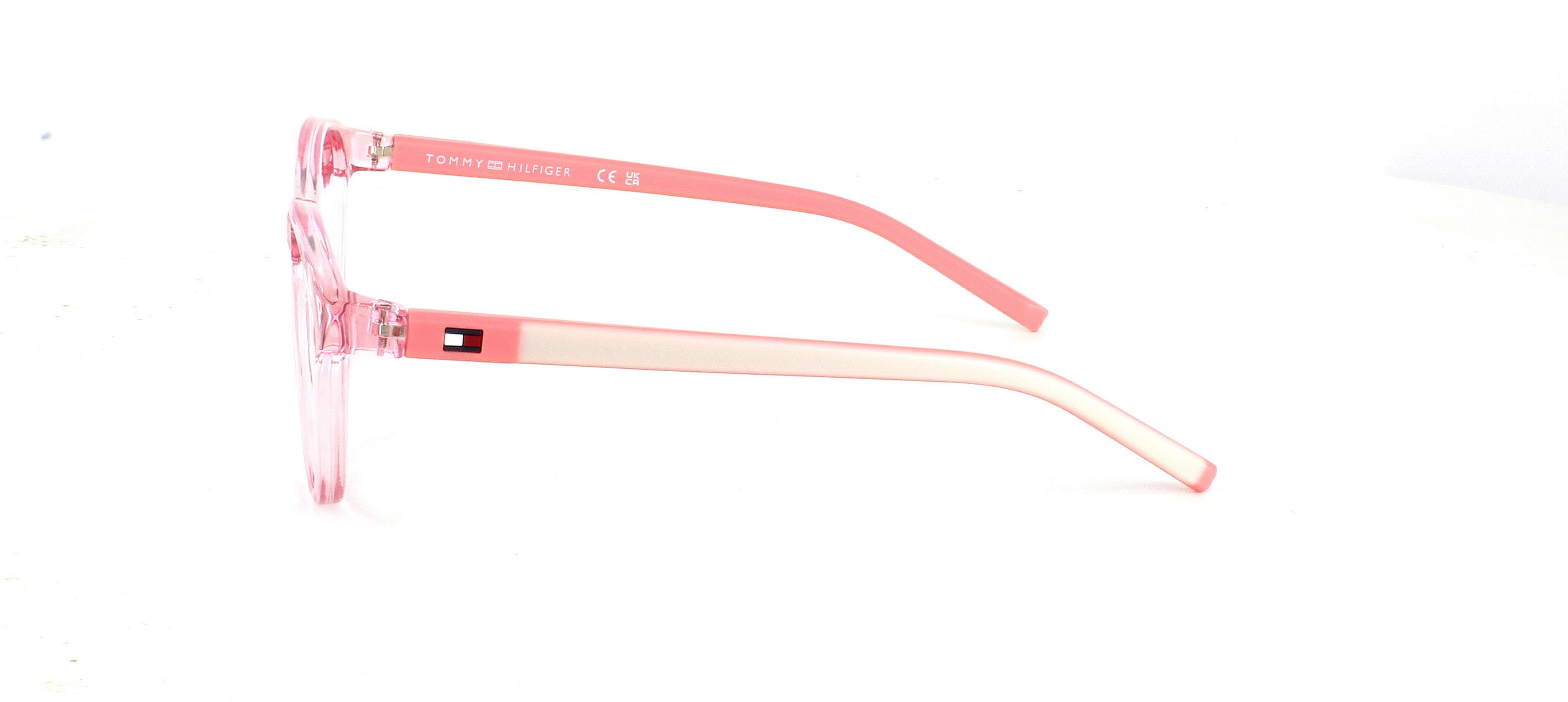 The temples are where the design adds its most charming detail, a beautiful two-tone gradient that moves from a deeper coral pink at the hinge through to a soft pearlescent cream towards the tip, giving the arms a luxe, almost jewellery-like quality when viewed from the side. The Tommy Hilfiger flag logo sits neatly at the hinge as a quiet but confident brand signature.