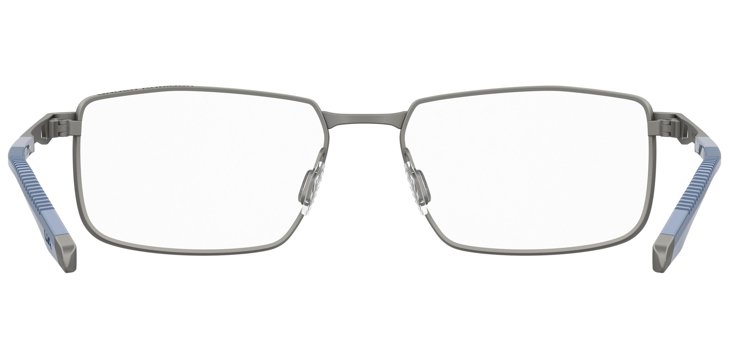 Under Armour presents its first pair of glasses, here presented in gunmetal with blue ear tips, made entirely from titanium. Their value comes from the intrinsic characteristics of the material itself. Titanium is much, much lighter than any other metal but very strong, plus it’s hypo-allergenic, flexible and long-lasting.