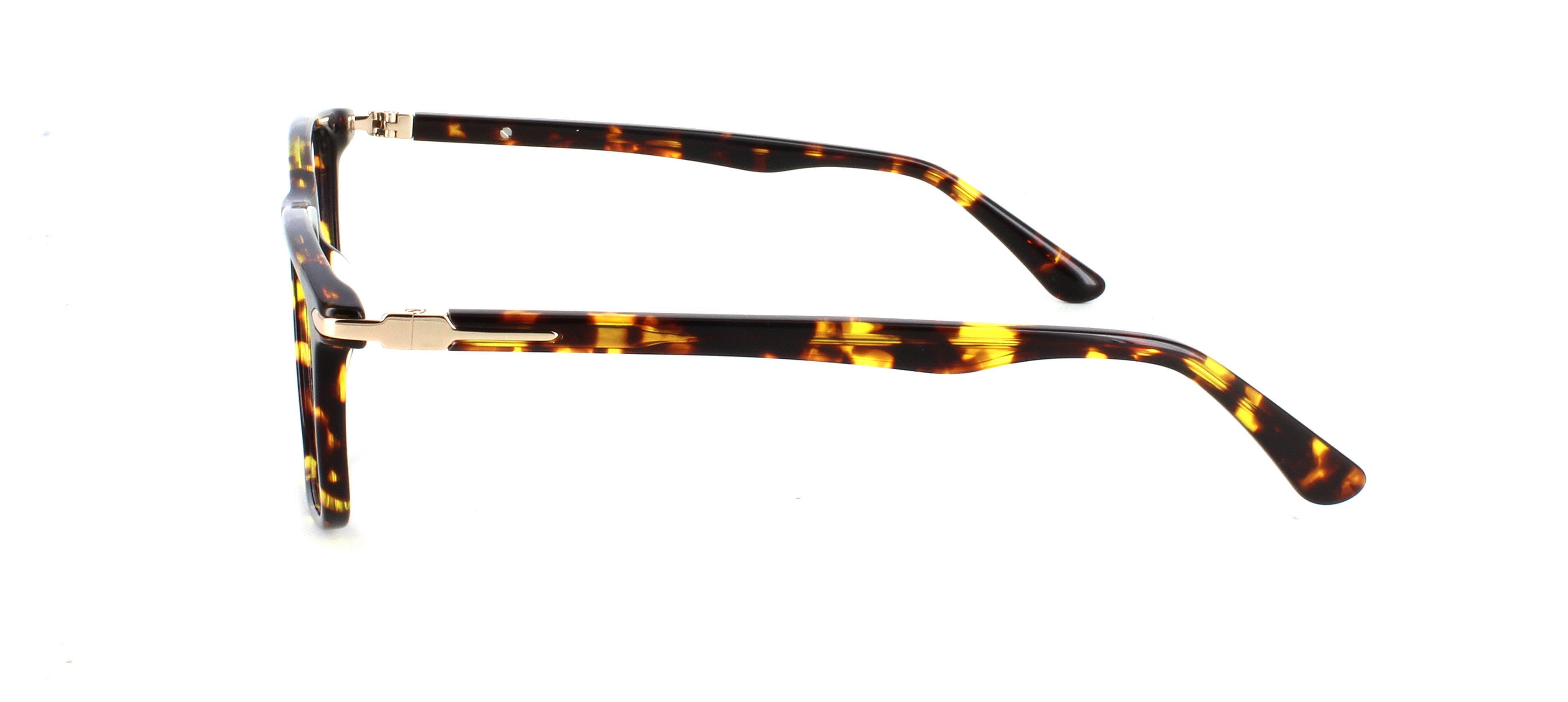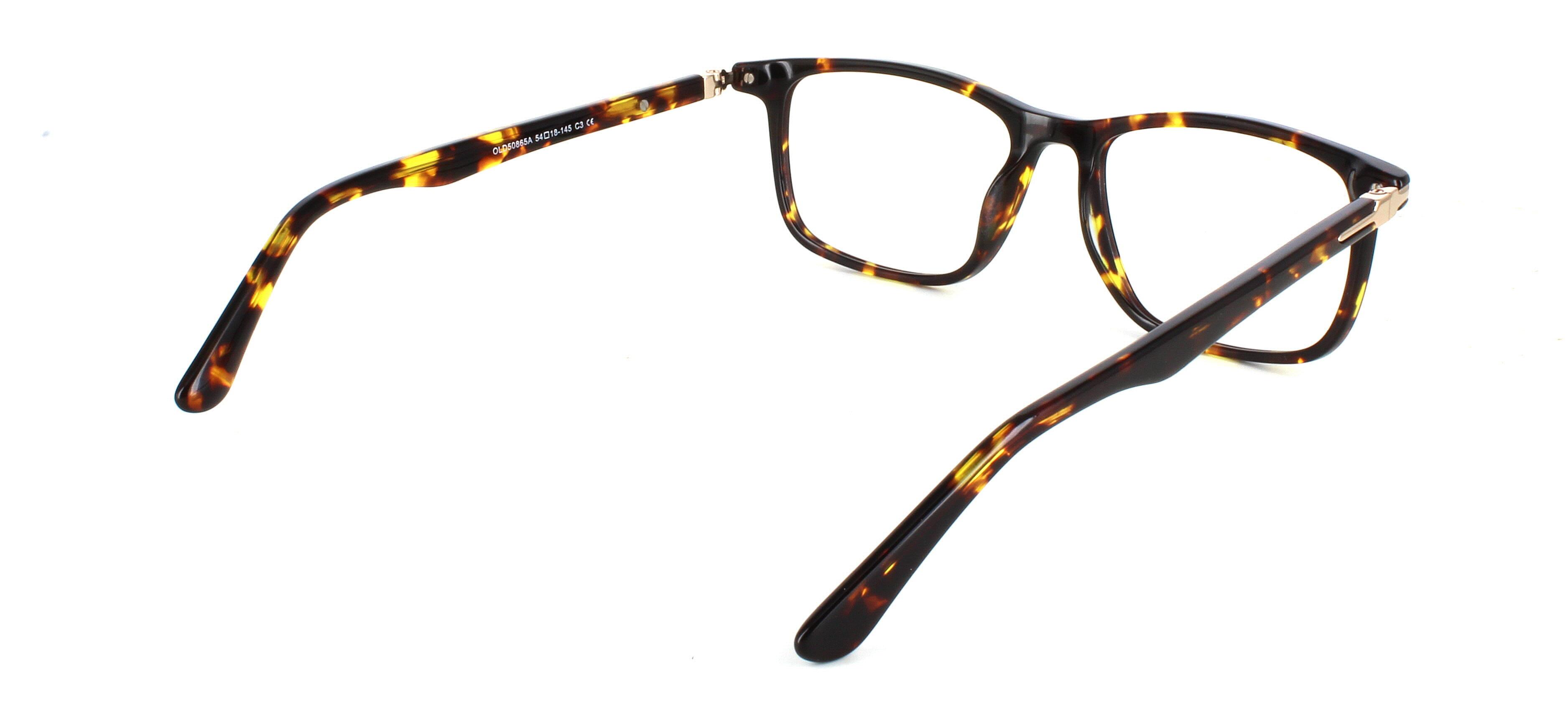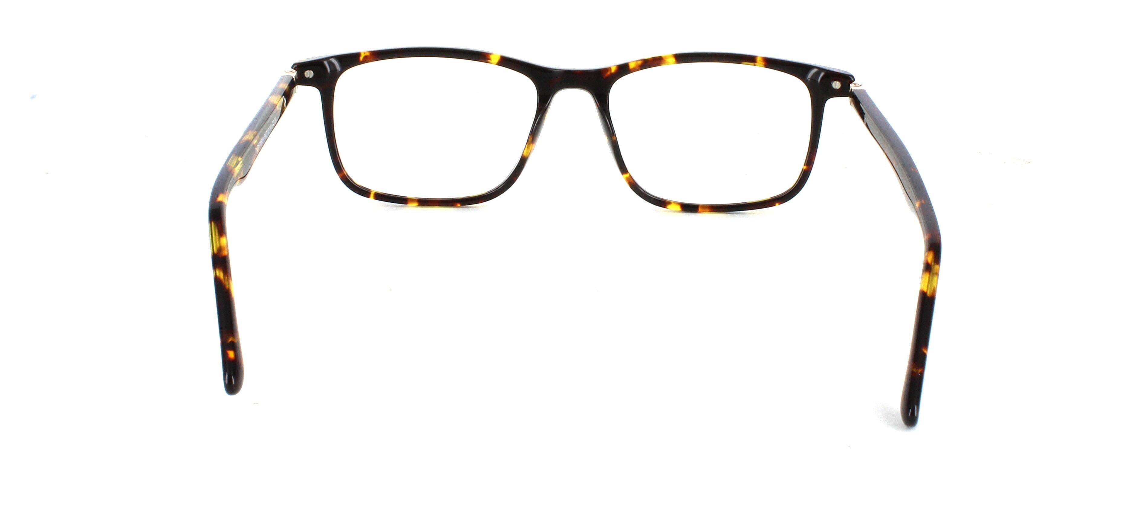 Stylish smooth unisex acetate rectangular shaped frame in shiny dark tortoise. Smooth matching acetate arms with barrel hinges.