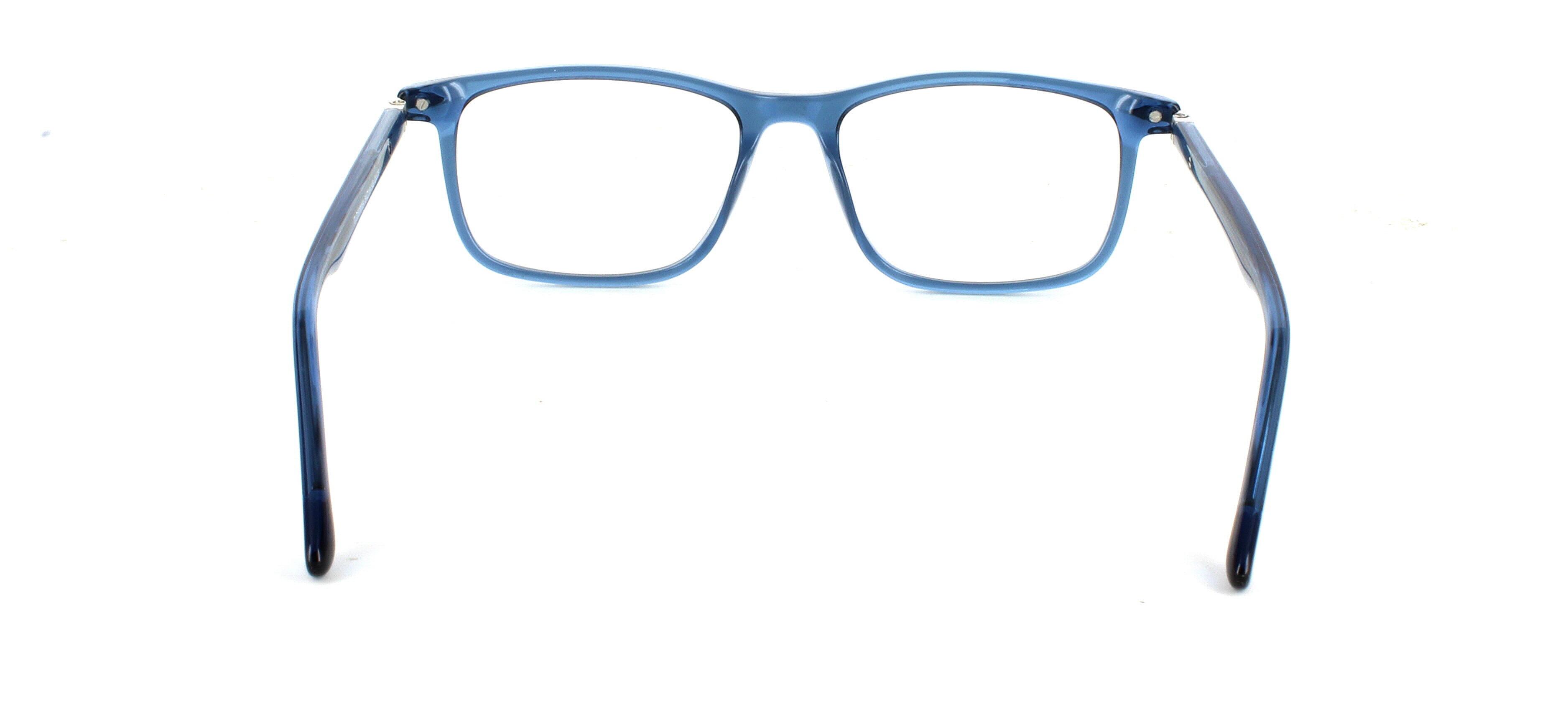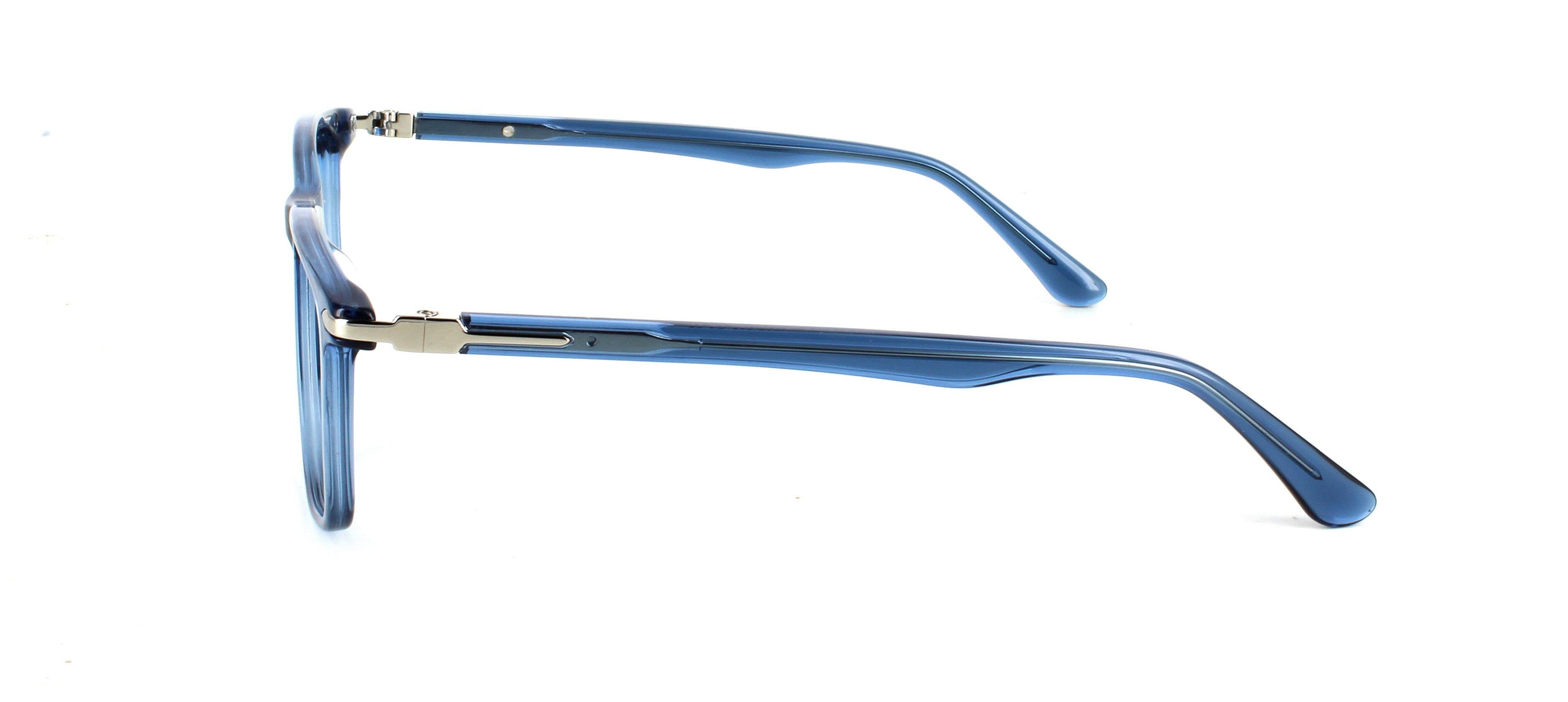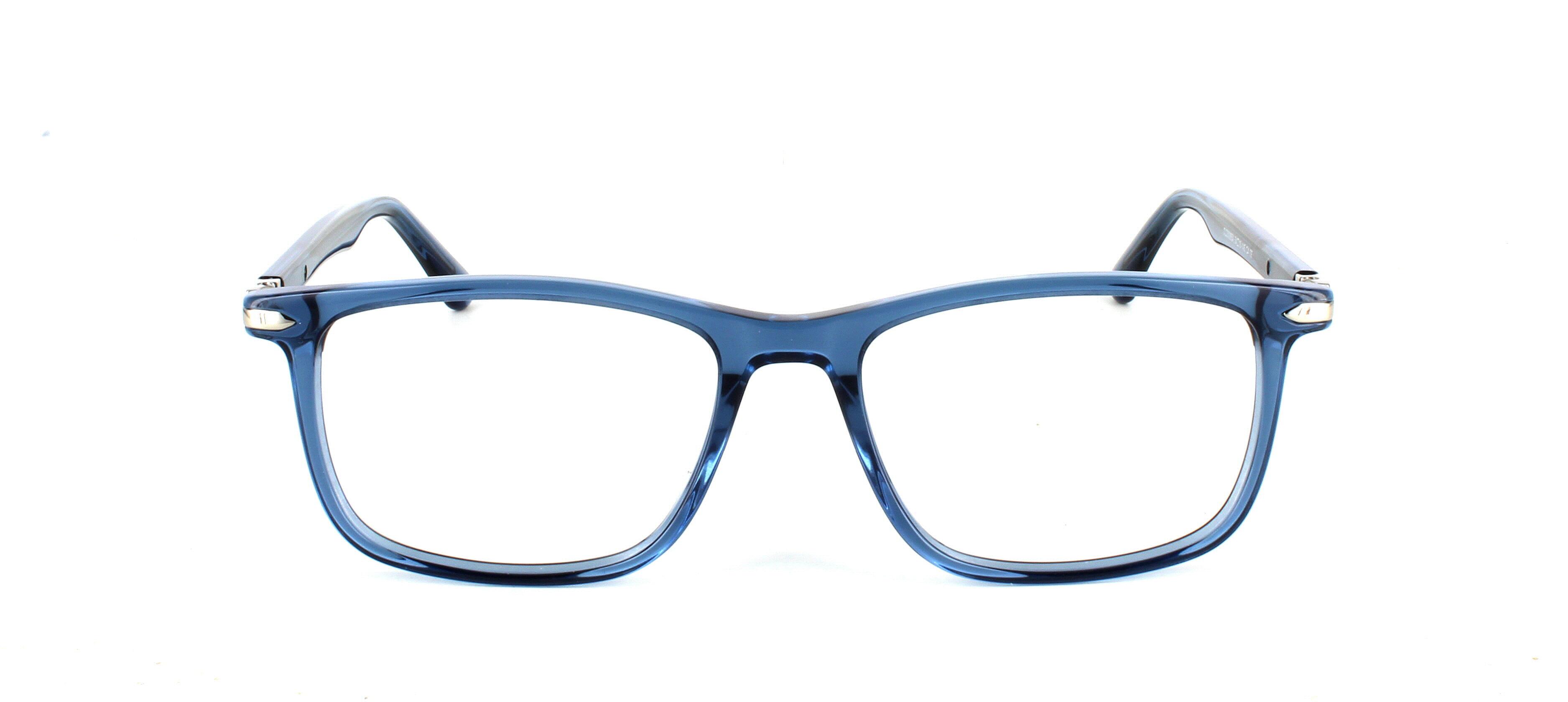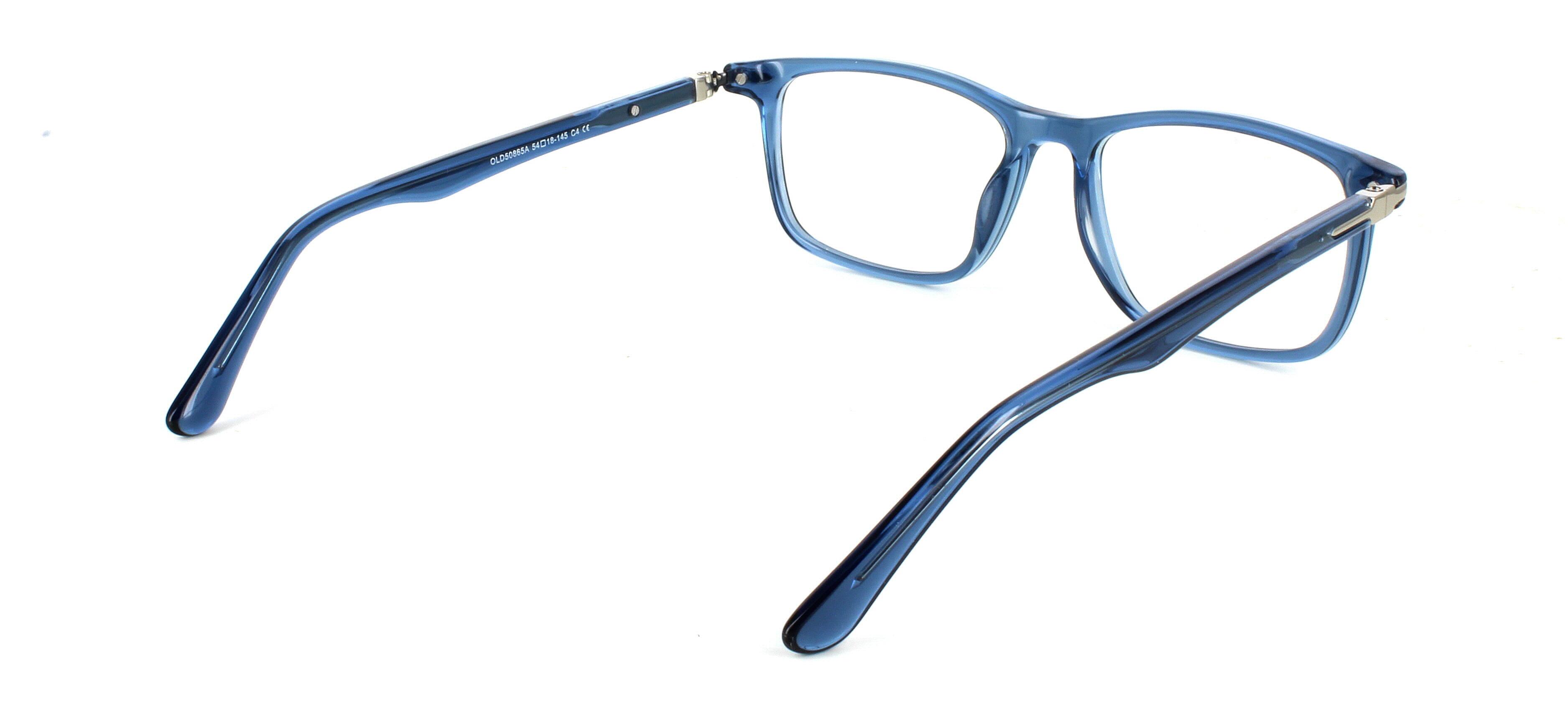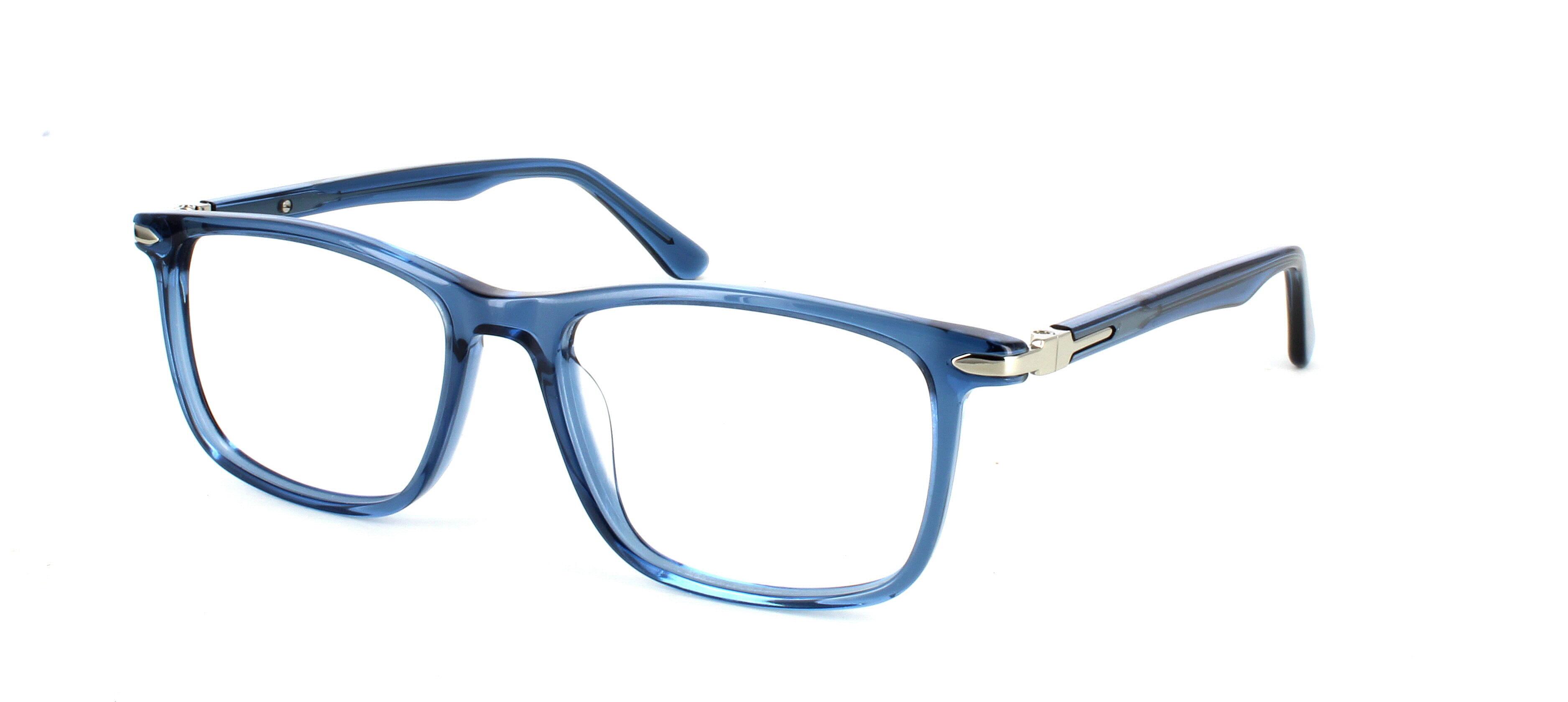 Stylish smooth unisex acetate rectangular shaped frame in crystal blue. Smooth matching crystal blue acetate arms with barrel hinges.